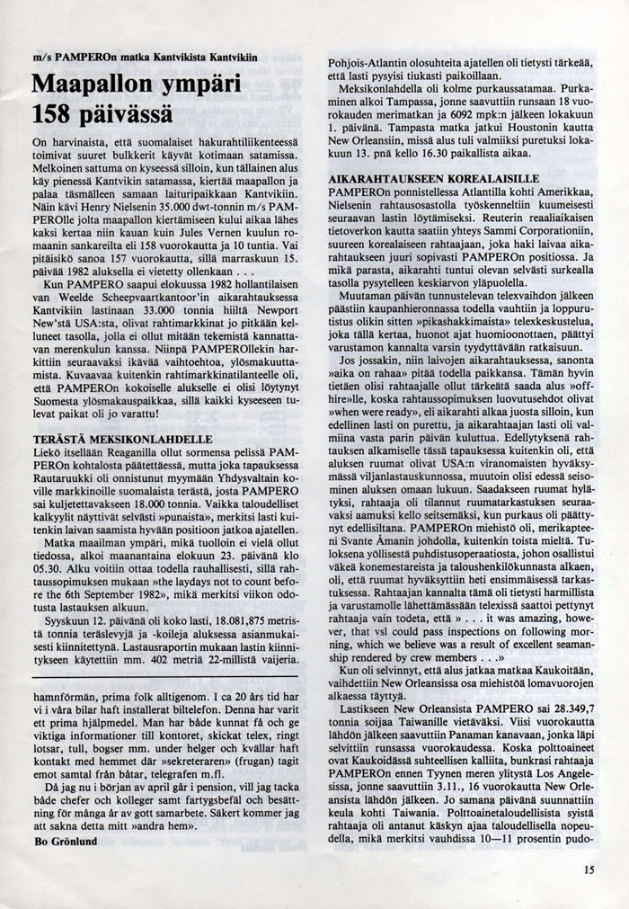 Joulunpyhinä soi kotona puhelin, että pitäisi lähteä Naantaliin TRAMONTANA miidsippitankkiin. Lyhyt vikaeerausjobi Rotterdamiin. Laivan salongissa mönsträysmiehen kirjoitellessa kontrahtia tiesi kippari Eerikki vikaeerauksen keston paremmin:"se on Rotterdam for orders". Eipä kumminkaan jouduttu maailmanympärysmatkalle, kun aikanaan orderit käskivät viedä öljykuorman Espanjan Bilbaosta Tukholmaan.