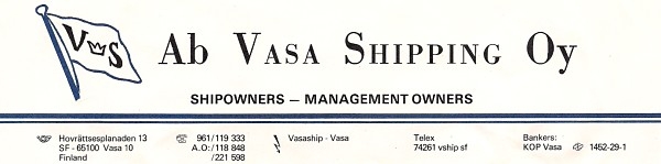 Joskus -81 tai -82 soitin Vasa Shippingille ja kysyin jobia. Niillä oli väliperämiehen paikka. Sovittiin, että tulen seuraavalla viikolla Vaasaan. Menin sovittuna päivänä, konttorissa istui kaveri, joka esitteli olevansa varatuomari "nn" ja jatkoi, että mitään jobeja ei ole eikä tule, firma on haettu konkurssiin.