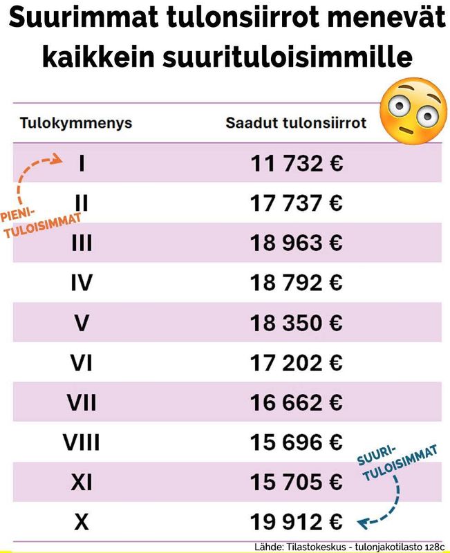 En tiedä mistä kehkeytyy ajatus, että kun huono-osainen saa valtiolta apua jokusen satasen tai tonnin, se on varkautta. Kun varakkaimmat saavat valtiolta mittavasti suurempia tulonsiirtoja, sen ajatellaan olevan heille palautuvaa "omaa rahaa".