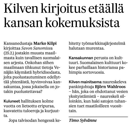 Kuopiolainen kansanedustaja Kilpi kirjoitti Savon Sanomiin ja se kirvoitti oheisen mielipiteeni Savon Sanomat 28.2.2026). Hallituspuolueilla on neljä kansanedustajaa Pohjois-Savosta. Kaikki uskollisesti ajavat etelän rikkaiden kaupunkien etuja. Kolme heistä äänesti jopa Iisalmen ja Varkauden sairaaloiden yöpäivystysten lopettamisen puolesta, kun etelän herrat olivat niin määränneet. Varmaankin hallituksen kansanedustajat häpeävät aikaansaannoksiaan, koska tarve on kova kertoa asioista päin vastoin, kuin faktatarkistetuista uutisista opitaan.