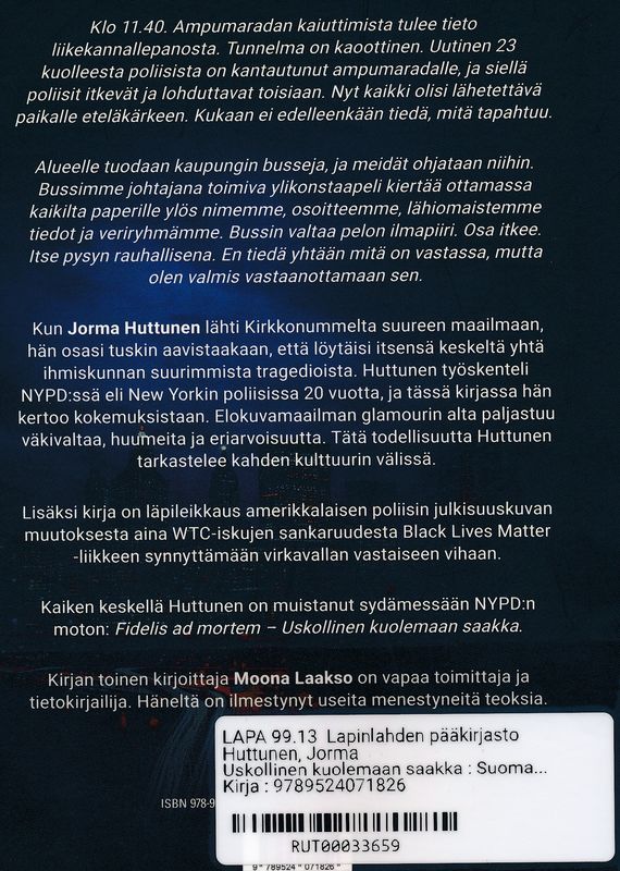 Jorma Huttunen & Moona Laakso: Uskollinen Kuolemaan Saakka. Suomalainen poliisina NYPD:ssä. Deadline Kustannus Oy 2025. Sivuja 239. ISBN978-952-407-182-6.